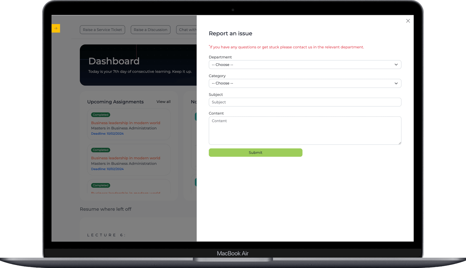 MEWBook offers in-portal support of any kind. You can send email or start a conversation with our student advisors right away for any of your questions or concerns. The features is available on all our LMS page for quick access.
