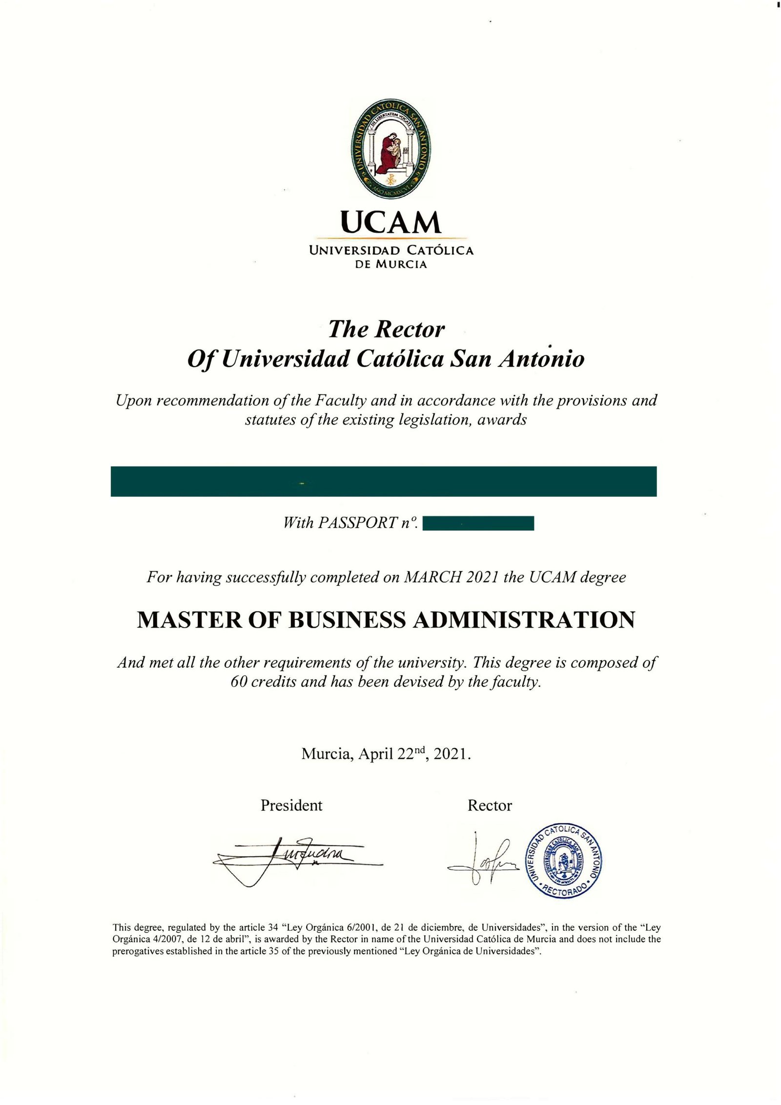 UCAM accredits and awards MBA in General Management, MBA in Global Banking and Finance, MBA in Operations and Project Management, MBA in Agile Supply Chain Management, MBA in Accounting and Finance, MBA in Marketing Management, MBA in Global Healthcare Management, MBA in Global Sports Management, MBA in Health and Safety Leadership, MBA in Energy and Sustainability, MBA in Artificial Intelligence and Blockchain, MBA in Public Relations and Advertising, MBA in Business Analytics, MBA in International Business and Relations, and MBA in Human Resource Management.